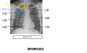 外语要求: 掌握重点词汇的英语表达: 肺野(lung field),肺门(hilum of lung),肺纹理(lung marking),空洞(cavity )与空腔( air containing space), | |